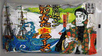 こんどはラーメン。男前の歳さんがイカス!左の船は勿論開陽丸だ!スープは醤油味。具を豪華に入れて食べよう。残すと副長の檄が飛ぶぞ! |